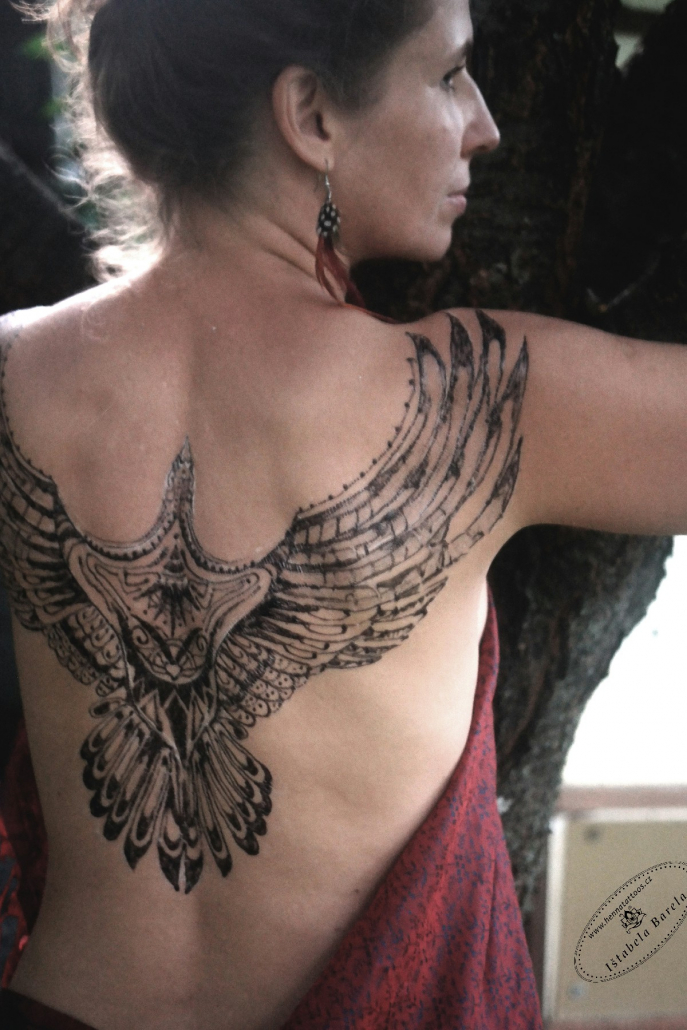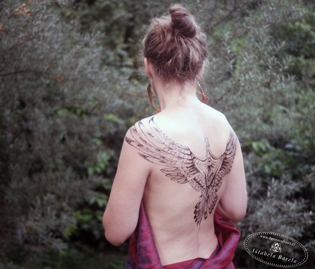 Malování Orlice na záda, doba obřadu včetně tetování 6 hodin, neinvazivní tetování vydrží 2 až 3 týdny. Postupně se vytmavuje po dobu prvních 48 hodin.